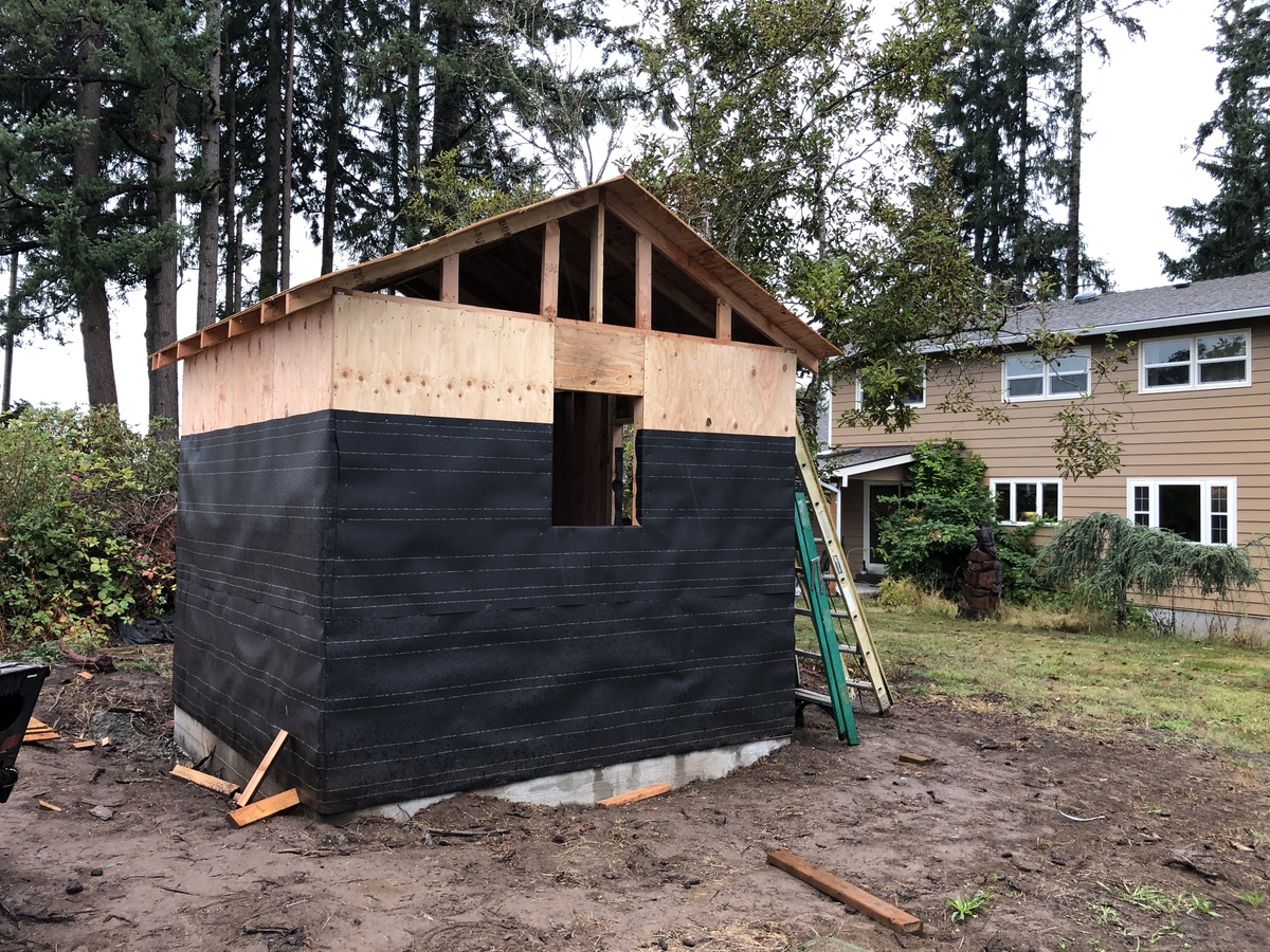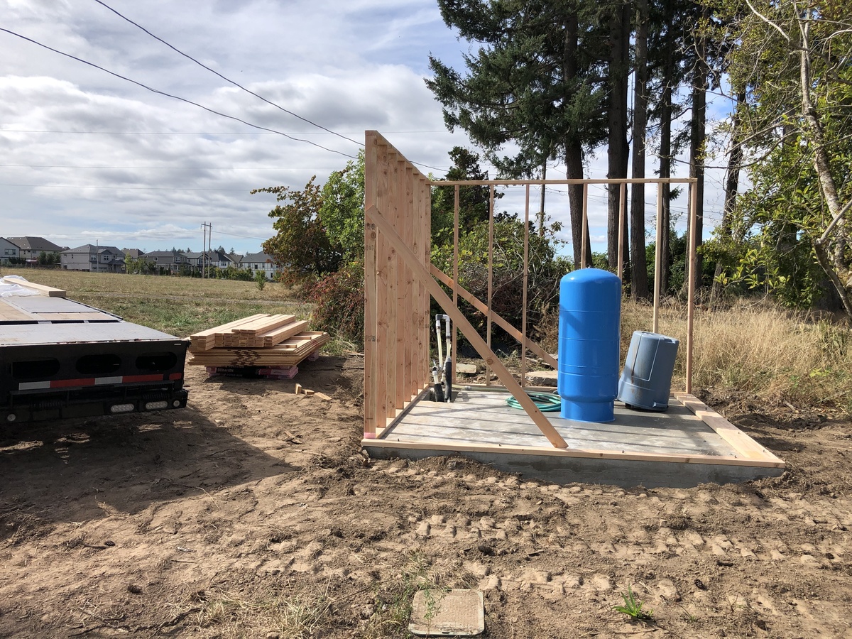 First came gently relocating the pressure tank to the side of the slab. Fortunately it was plumbed with flexible PEX pipe so I was able to move it. Then I had to demo the old slab, form up the new slab and pour concrete. Once concrete was poured I had to place the pressure tank back on the new slab and then build the pump house around it.