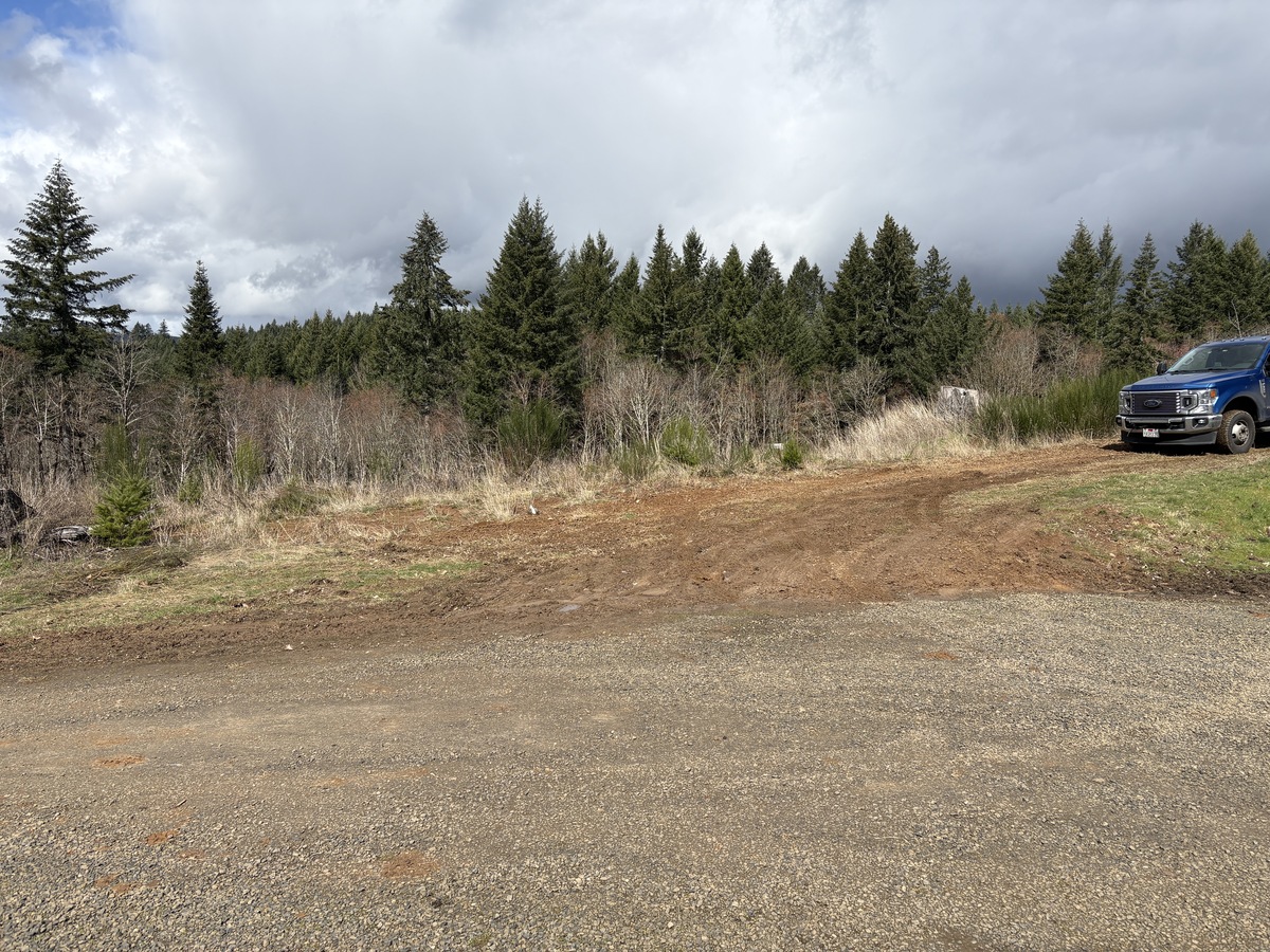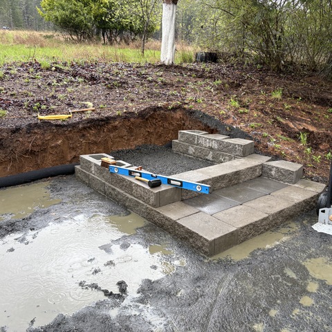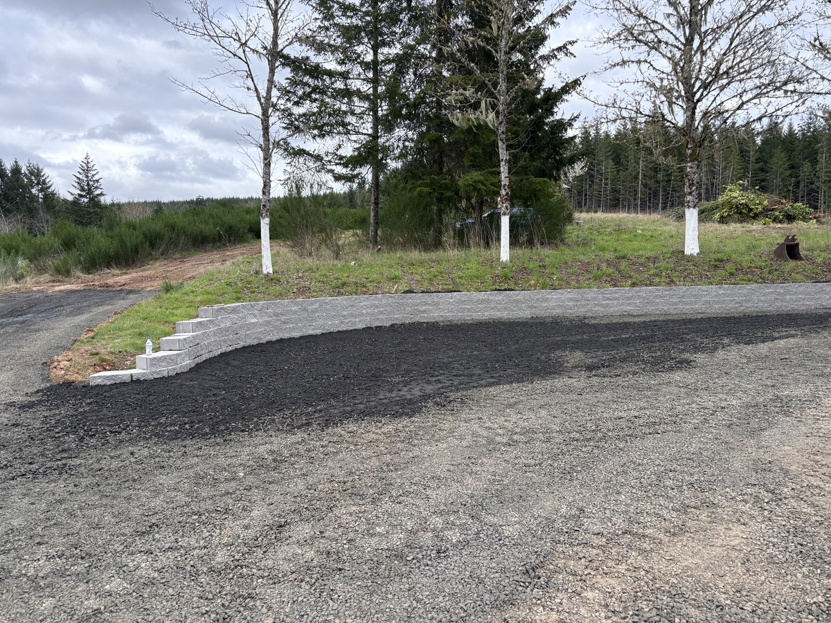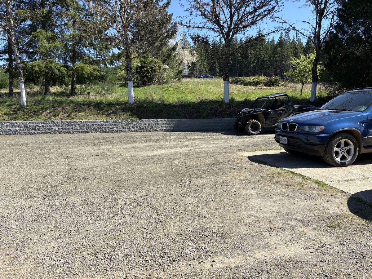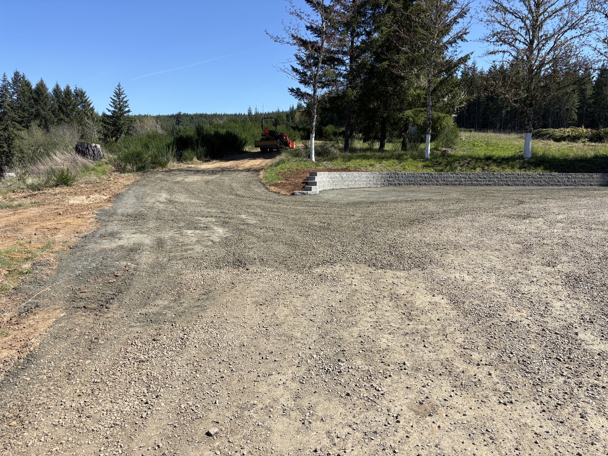 For this project, the homeowner wanted to reclaim some usable parking space and eliminate the soggy muddy mess at the bottom of the slope. So we started with a clean cut to bring the grade to a good sub grade below the driveway elevation. Applied a road base fabric to keep the mud from pushing up through the rock. Then we added a base layer of rock as well as a retaining wall to make the edge of the hillside look clean and keep from eroding. I also added a stairway to match the retaining wall blocks used for a smooth access to the upper level of the yard. On the side of the driveway we extended the road up a short way to create a turn around and also add more parking area.